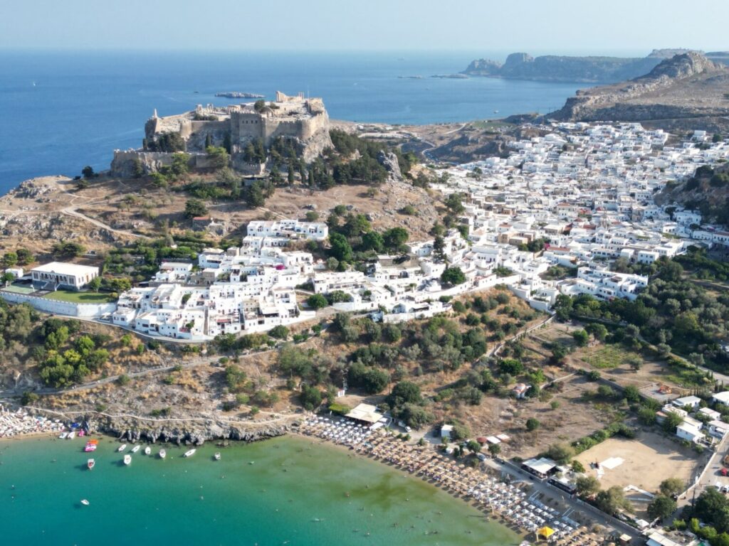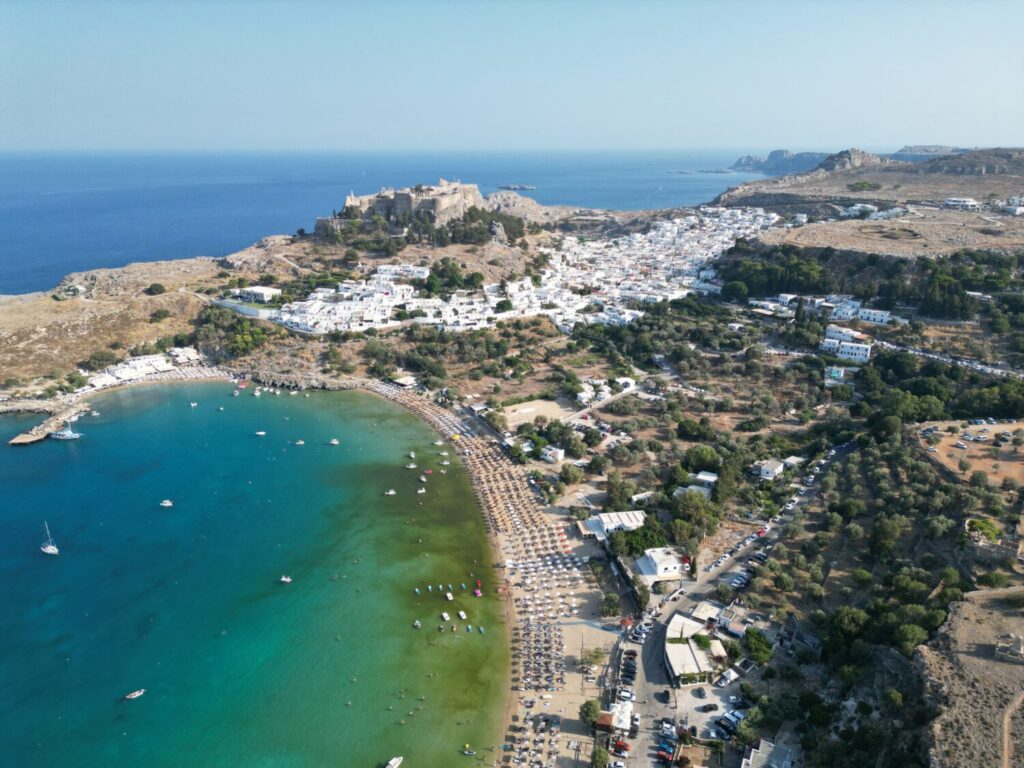 Lindos ist weltbekannt für seine weiß getünchten Häuser und die spektakuläre Lage. Von der Akropolis bietet sich ein traumhafter Blick auf die Bucht des heiligen Paulus – eines der bekanntesten Fotomotive der Insel.